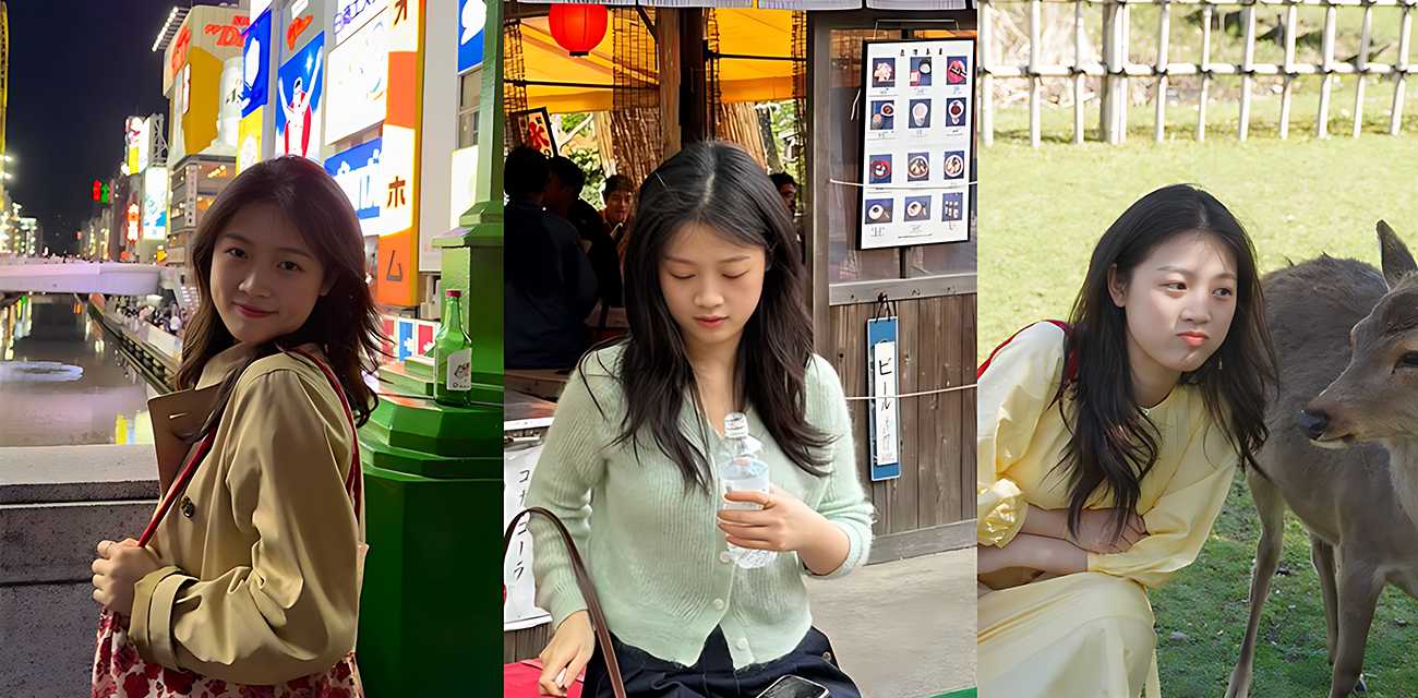 超级清纯!白天在奈良公园和小鹿合影、道顿堀夜景微笑、古风茶屋喝水,完全是乖乖女大学生形象。
