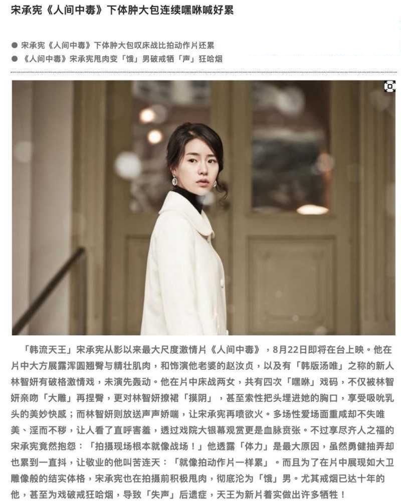 该文章由91吃瓜发布,转载请注明来源并附上原文链接: 韩国高颜女神林智妍主演电影人间中毒与宋承宪车震片段流出