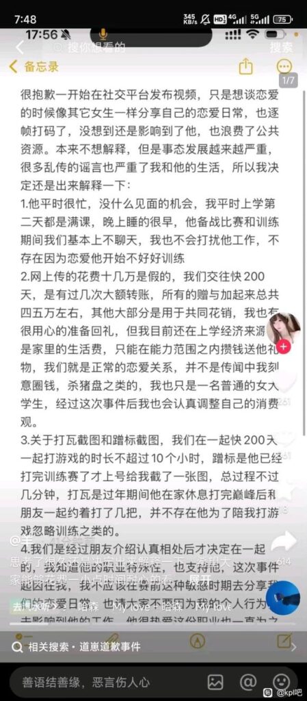 广州TTG战队王者荣耀职业选手道崽,被曝恋爱百天内为女友转账超10万元,并赠送高价首饰(如巴黎世家鞋、金手链等),引发“杀猪盘”质疑,其后更是被曝出私底下竟是卖定制片的福利姬。
