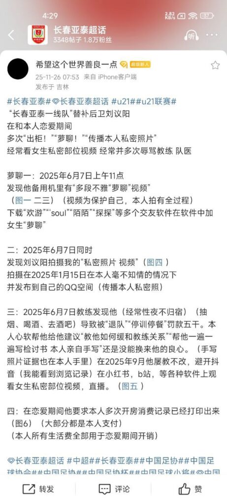 该文章由91吃瓜发布,转载请注明来源并附上原文链接: 还有高手国足迎来至暗时刻亚泰u21球员刘议阳出轨事件
