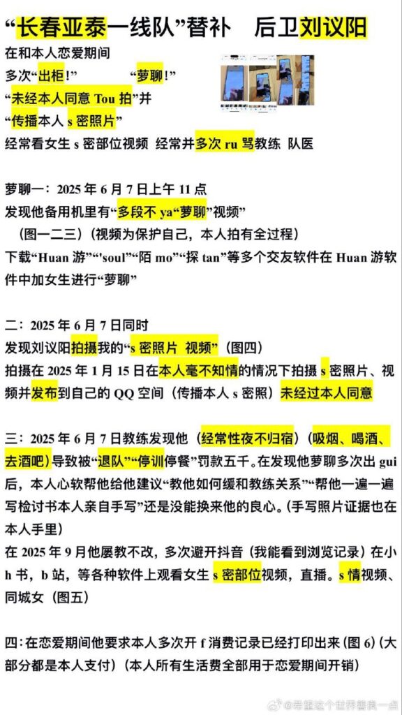 放低抵抗还是一挺到底?詹景源事件之后,亚泰u21球员刘议阳出轨约炮事件登顶热搜,国足球员面临信任危机(或许本来也没有),本以为可以挣扎一下,没想到却再度被甩出实锤证据。