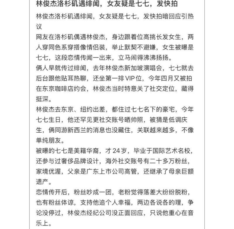 该文章由91吃瓜发布,转载请注明来源并附上原文链接: 实力派歌手林俊杰官宣新恋情女友analisa七七被传外围女