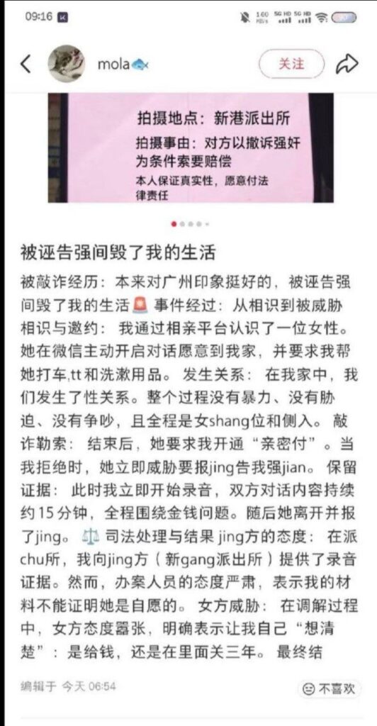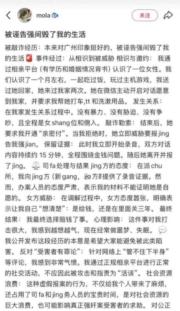 近日,一位博主在小红书上发文,称自己遭遇了一起荒唐的纠纷。网传聊天记录显示,对方在相亲时主动邀请其到家中,双方随后发生性关系;事后对方反悔,向其提出强迫行为指控,并要求赔偿所谓的生理损伤修复费用。