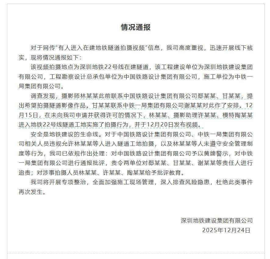 12月23日,深圳一处在建地铁隧道发生惊险一幕:一名女子未经许可擅自进入22号线施工隧道,在隧道内拍摄并将相关视频发布到短视频平台。