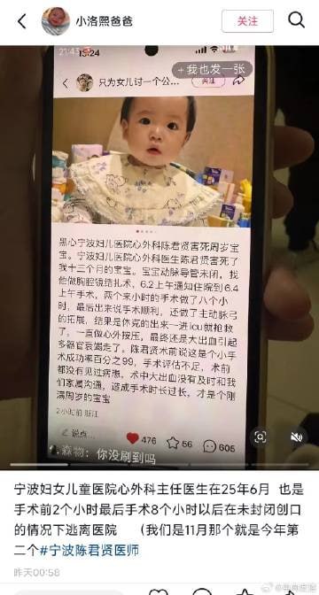 该文章由91吃瓜发布,转载请注明来源并附上原文链接: 网传视频实名举报宁波大学附属医院陈贤君微创手术害死婴儿