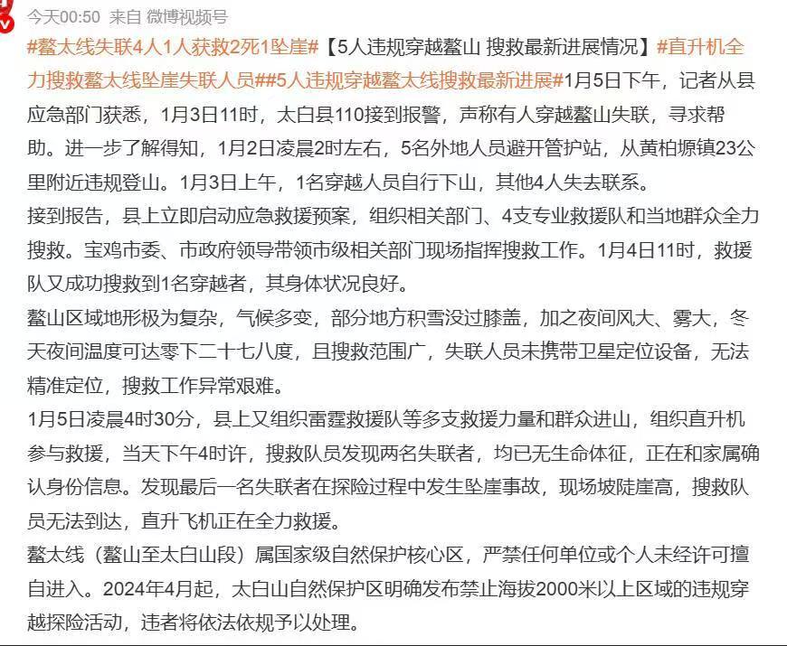 有时候不得不佩服这些xxn,明明到处贴满了禁止通行和危险警惕的告示,还偏偏去往火坑里钻。5人全女登山队,闯入鳌太线最危险地段,结果导致2人死亡,1人坠崖,一人失联,1人在发现事情不对时,自行脱离队伍下山。