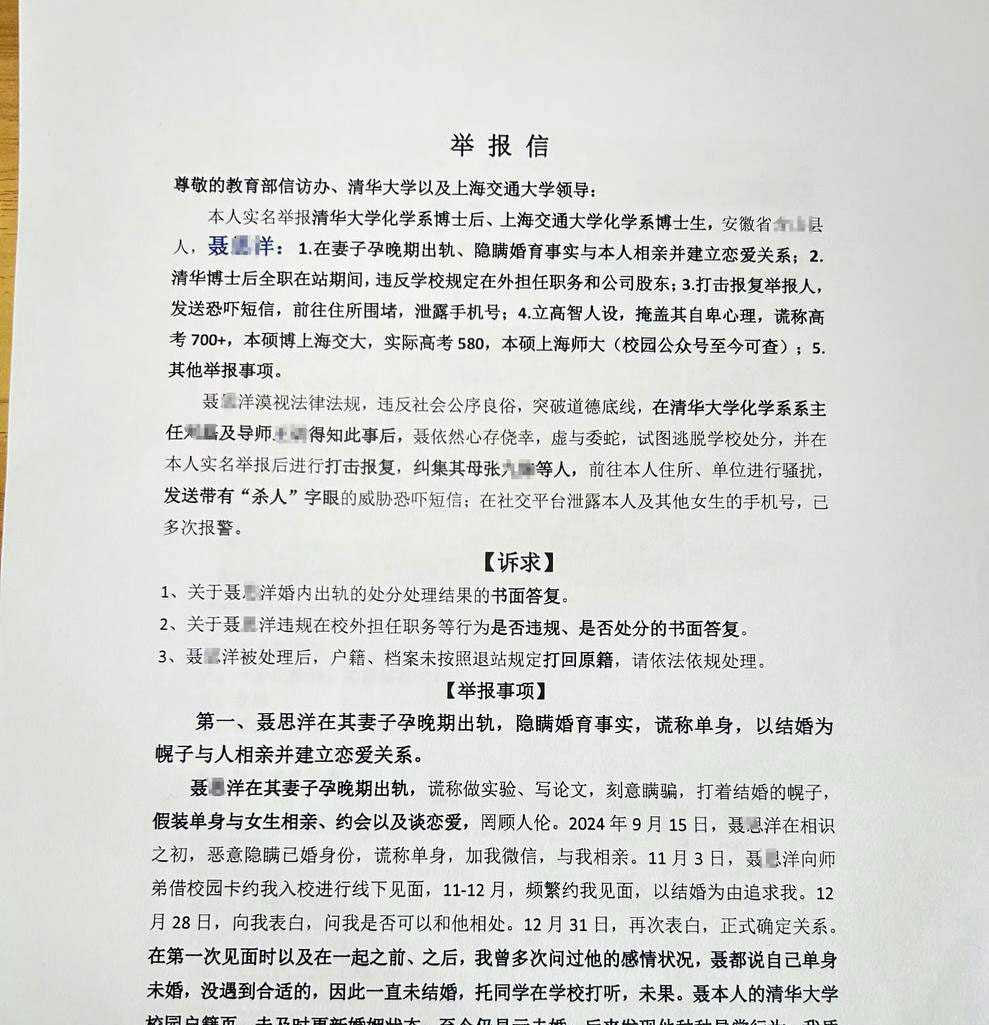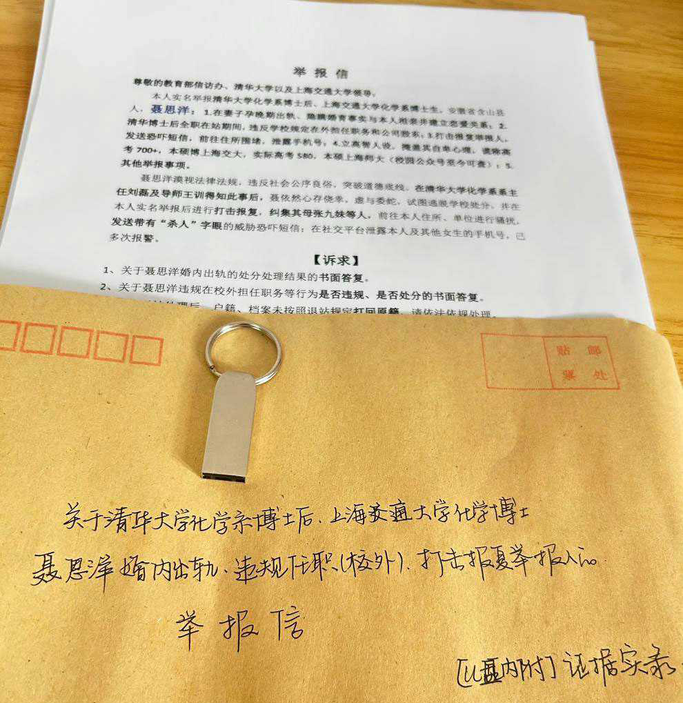 据一名女子举报,清华大学博士后聂思洋被指在婚内出轨,事后还对该女子进行恐吓与威胁。该女子忍无可忍,将一封举报信递交至清华大学校党委,要求对此事展开调查处理。