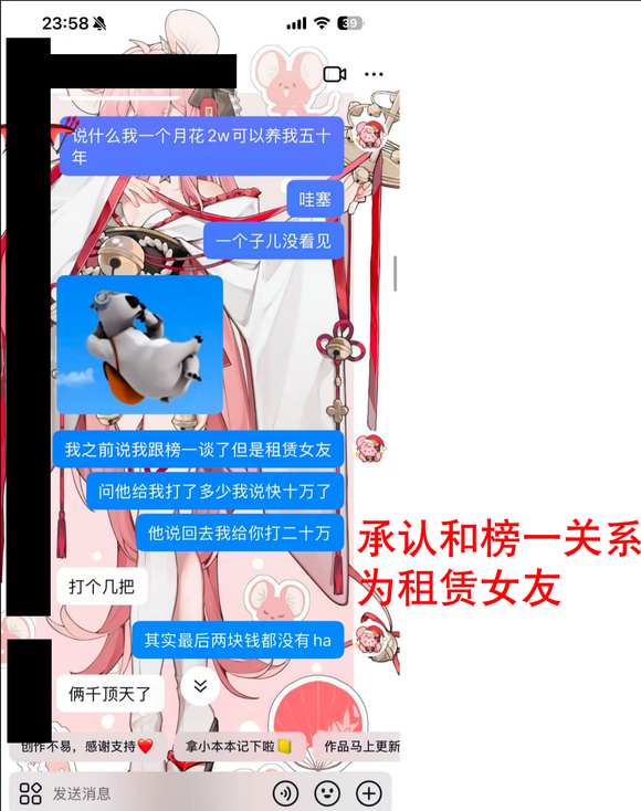 但是此时她警觉了,问苦主认不认识苦主小号,苦主说不认识,借机聊了几句。此时苦主依旧装作什么都不知道,问她我们养的仓鼠有没有寄走,因为是苦主约的快递。此时她没有回应,只是说这几天会到外面住。但其实早已把人领进家门,仅仅是晚上去外面开房住而已,从未提过榜一过来的事情。苦主尝试最后一次挽回,得到了否定的答复后就开爆了。