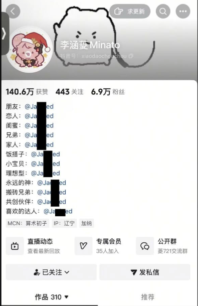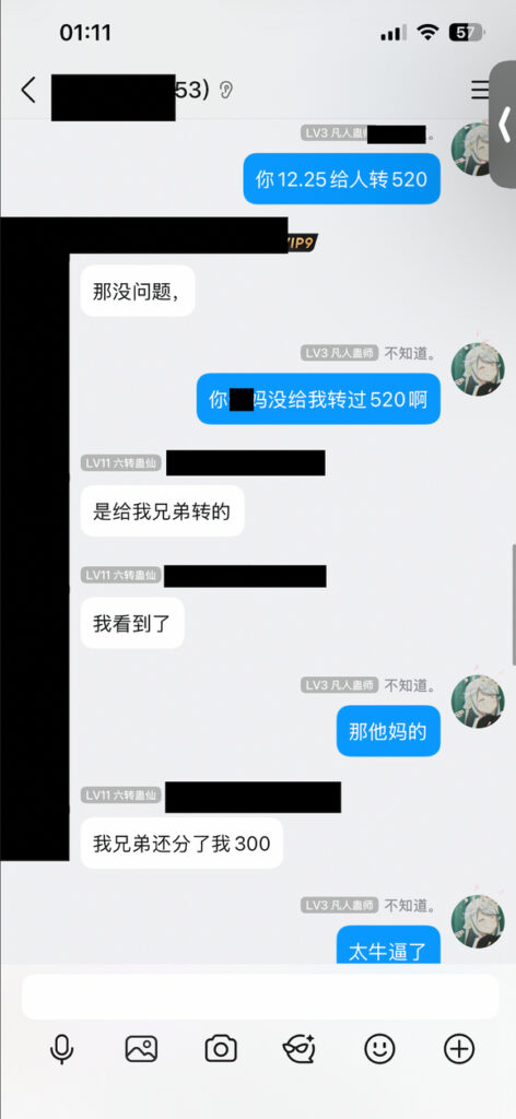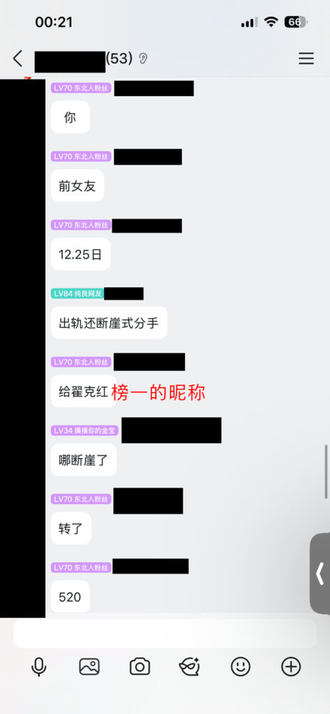9号晚上有一些人注意到了苦主,都是是她以前切割的粉丝。苦主由于不打扰她的事业,所以从未干涉或打听她直播中发生的事情。因为她不让苦主进舰长群,也不让在直播间发消息。她以前切割的粉丝找苦主进了小团体。这时候有意思的来了。小团体群里,有个榜一的兄弟,告诉其他人,12.25那天,她给榜一转了520。