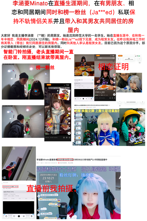二次元网红,新晋爆火coser李涵菱Minato,被男友甩出大量是实锤证据,爆料李涵菱在和自己交往多年期间,与榜一大哥暧昧不清发展地下情,甚至带回家doi。