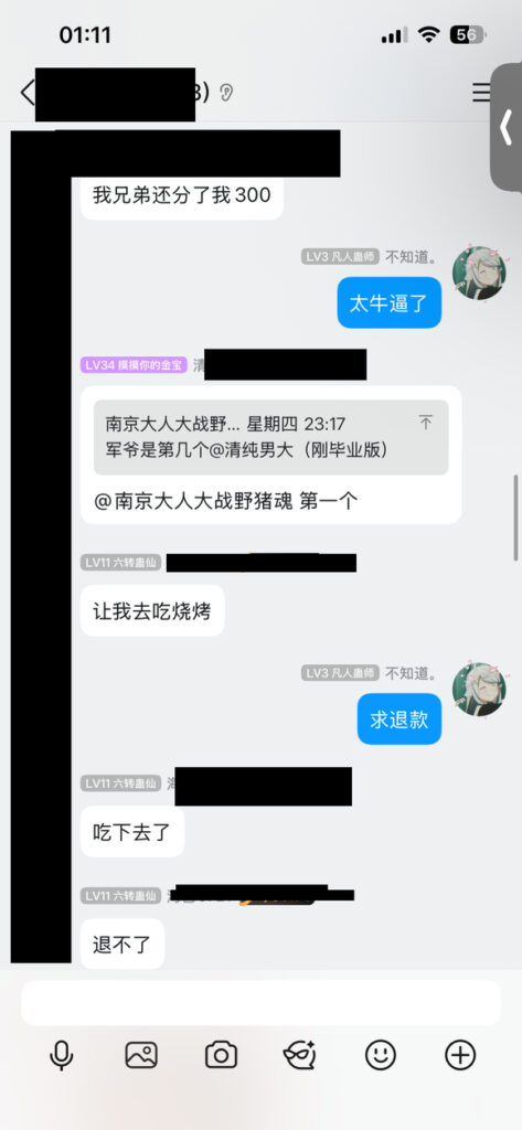 在家里她一直不让苦主看她的手机。同时,也不让苦主知道过多她和粉丝的内容。所以那几天闹得不愉快,因为就算躺下了也会一直看手机聊天,苦主尝试假装睡着,发现她会立刻拿手机和榜一聊天。苦主不是很高兴,就大吵了一架。她说我不信任她,说她仅仅是为了赚钱而已,不会退让,如果觉得不舒服,就重新考虑这段感情吧。苦主沉默、道歉、退让了。