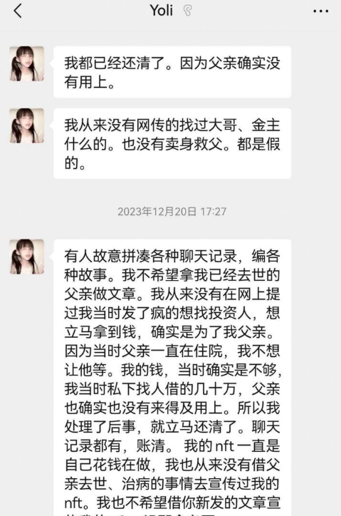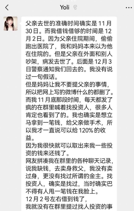 本就高消费且早有债务纠纷,如今在本已雪上加霜的情况下再遭重创。她入不敷出、背负沉重债务,身边好友透露其已几近崩溃。此外,有消息称其家庭境况复杂:为给父亲治病曾大量借贷,为筹款在X平台从事果聊,却疑似被一家诈骗公司利用;其父亲也曾因婚外情导致家庭破裂,最终据称在情人的住所去世。