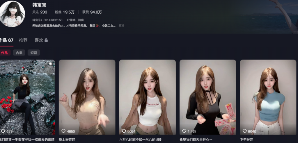 抖音上拥有20万粉丝的网红韩宝宝,凭借略带“擦边”的风格迅速走红。她的颜值与身材堪比明星,表面看似娇羞含蓄、舞姿收敛,实则老练自若、游刃有余,轻松俘获资深观众的目光。付费定制户外露出挑战视频流出