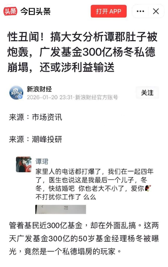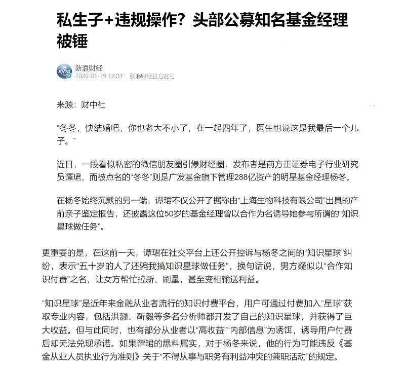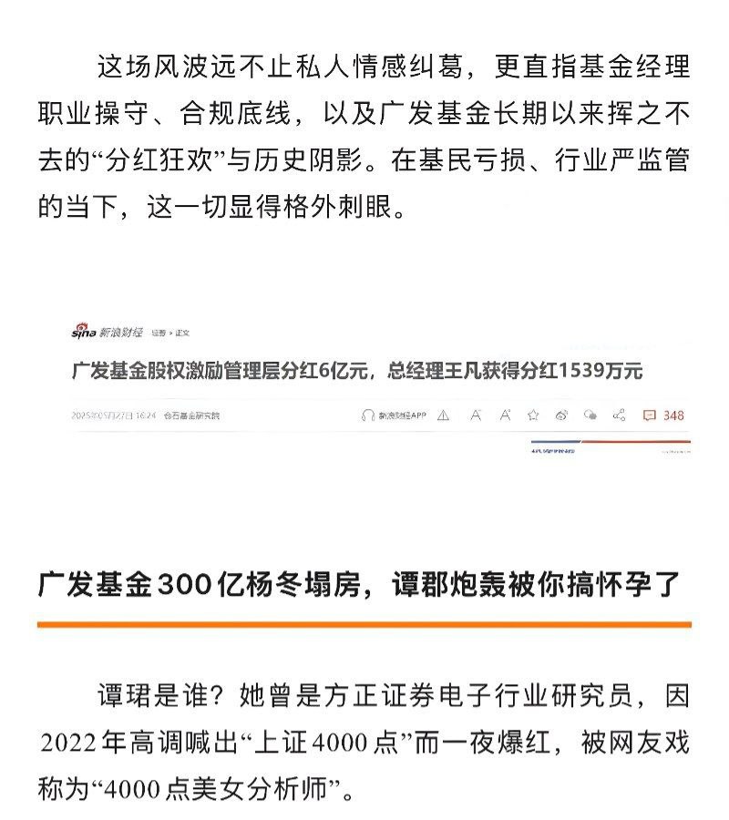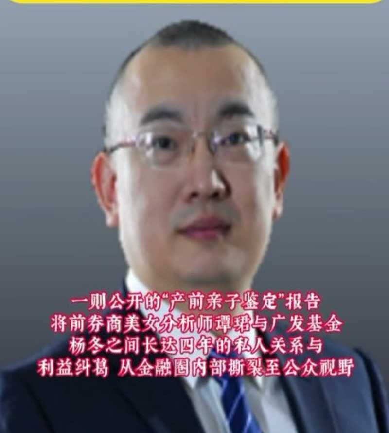 广发经理杨东被公开指控称,广发基金经理杨冬与其保持了四年私密关系,导致指控者怀孕。对方还公布了疑似亲子鉴定报告和法律咨询意见书,声称孩子是“最后一个儿子”,并催促杨冬结婚并承认亲子关系。
