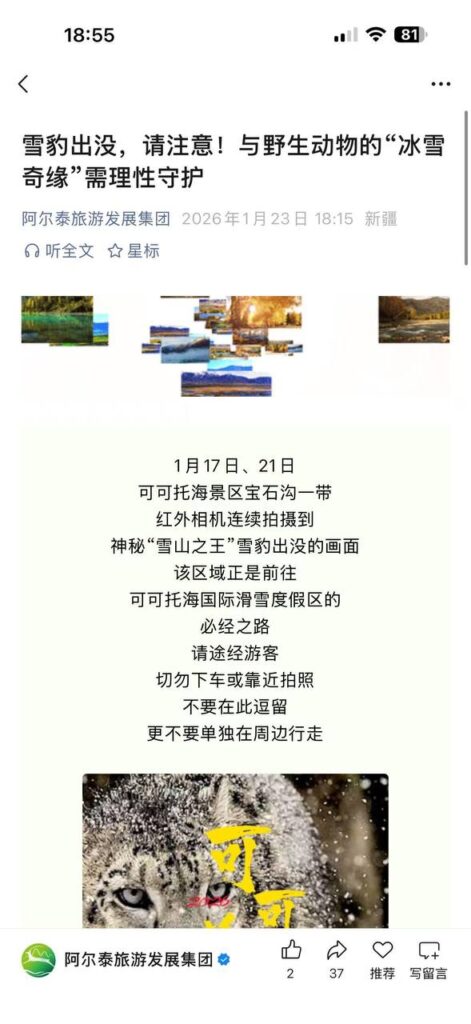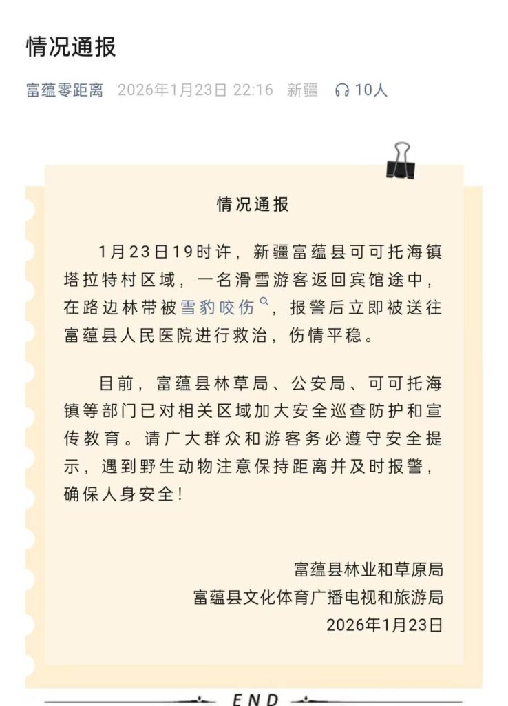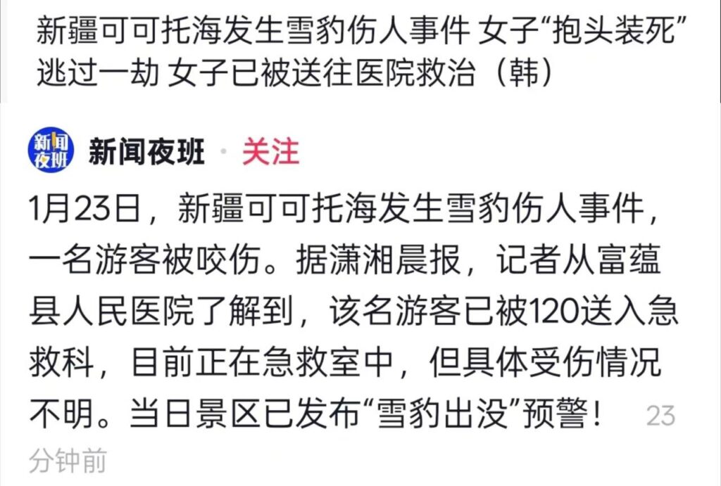 1月23日,可可托海发生雪豹伤人事件,迅速引发关注。返程的一名女滑雪游客在景区多次发布雪豹出没警示后仍靠近拍照并试图触摸,遭雪豹突袭咬伤面部,血染滑雪服。伤者送医后伤情稳定。此事提醒游客务必遵守景区安全提示,切勿接近或干扰野生动物。