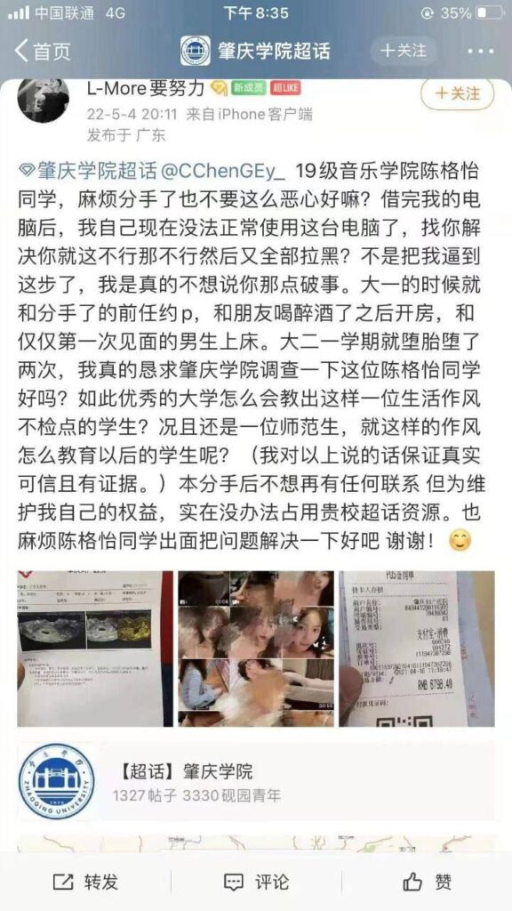该文章由91吃瓜发布,转载请注明来源并附上原文链接: 肇庆学院男宿舍捉歼19级音乐模范生陈格怡劈腿事件