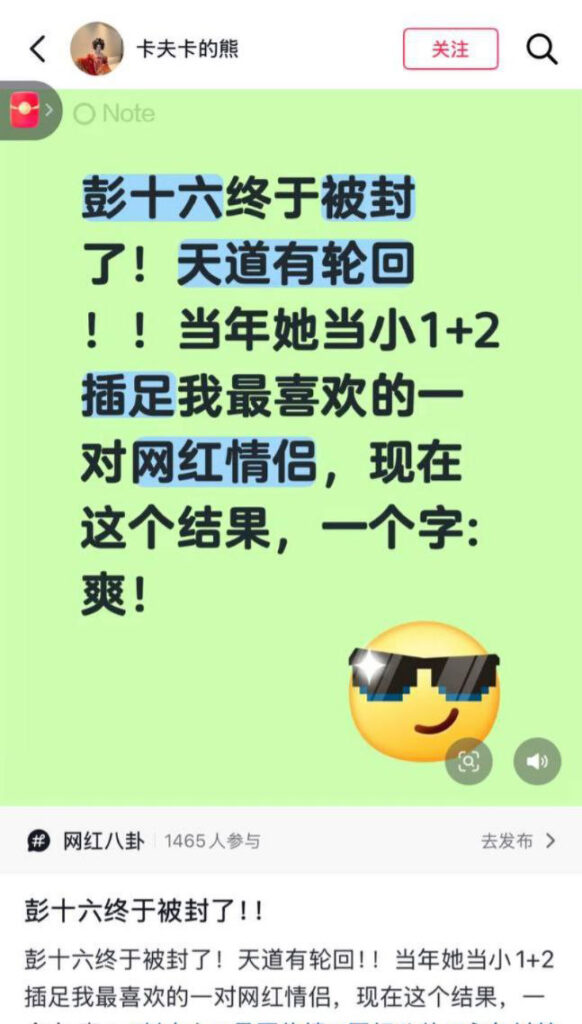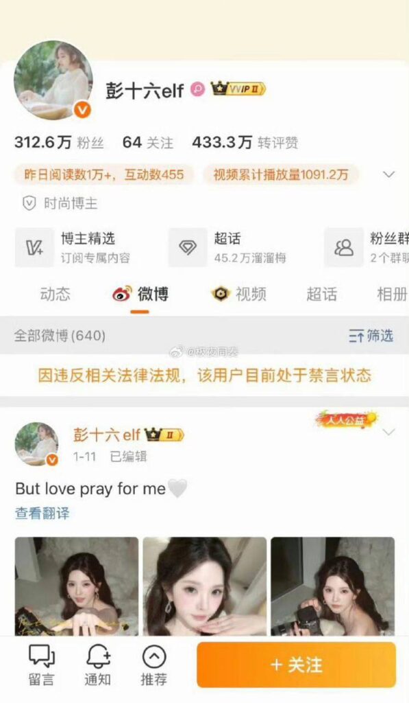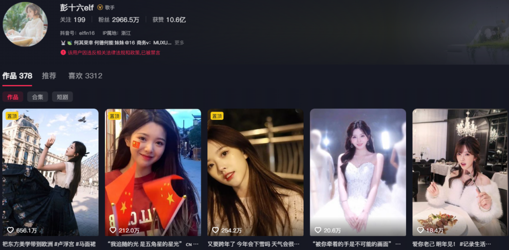 抖音第一代网红彭十六elf坐拥3000万粉丝,清纯人设彻底塌房,疑似因偷税漏税微博抖音账号被全网封禁,此后更是被传出小三上位等大瓜。