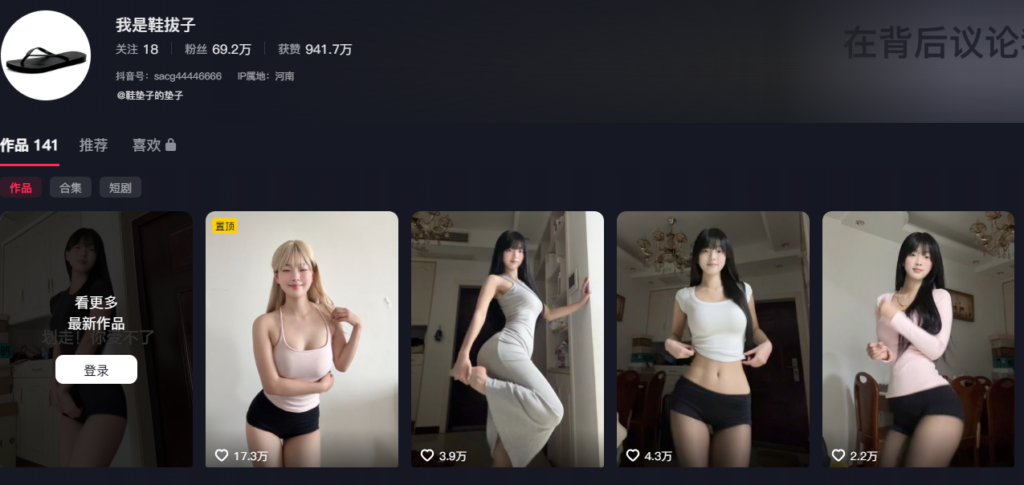 抖音账号“我是鞋拔子”吸引43万粉丝。博主有舞蹈专业背景,以带有擦边意味的表演走红;虽非传统“高颜值”,却凭优雅身段与修长双腿在平台上仍具吸引力与竞争力。
