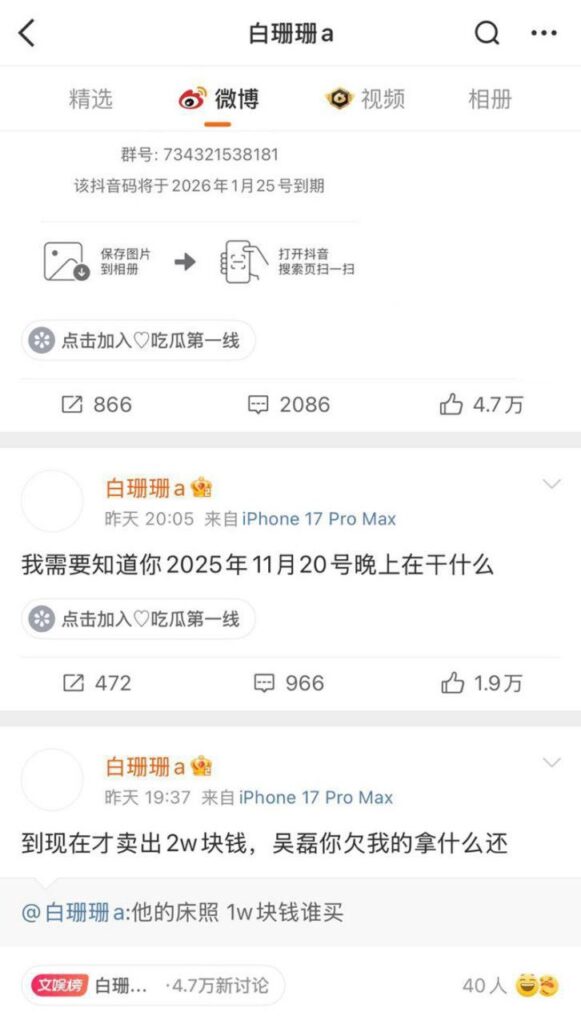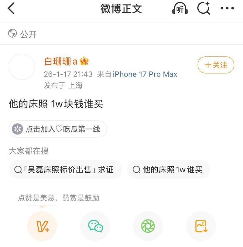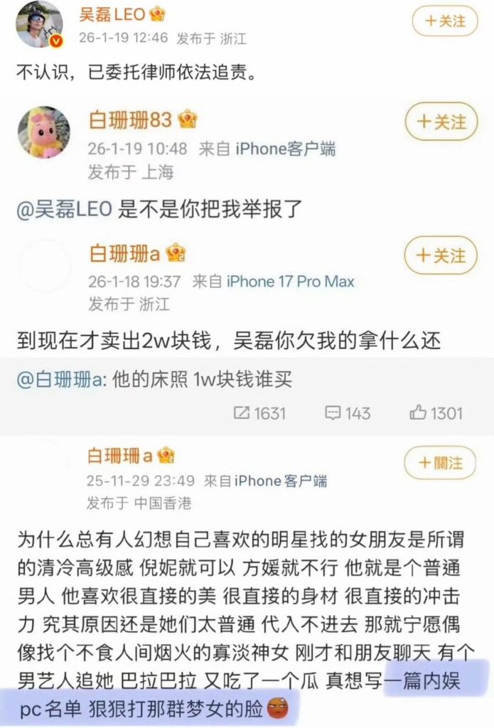微博爆料吴磊出轨劈腿,要求吴磊说明当日行踪,甚至1w块出售吴磊床照