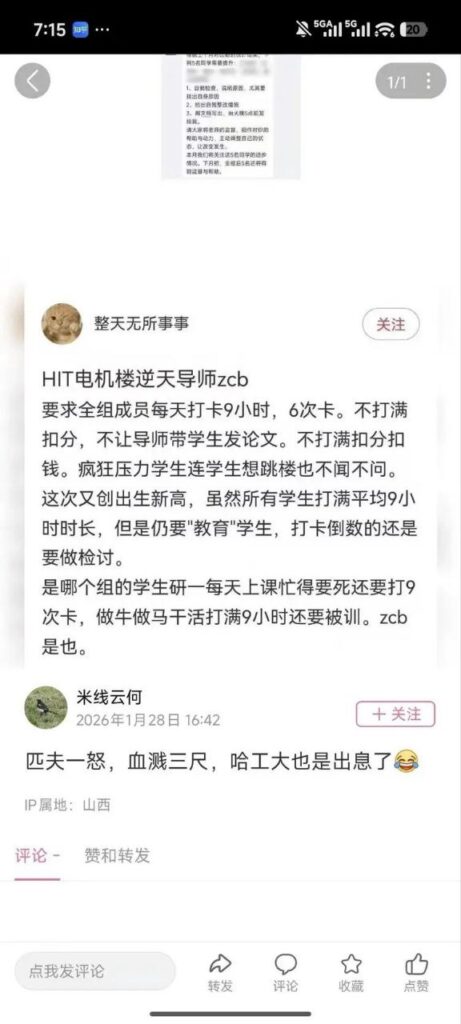 网传哈尔滨工业大学,一名电气专业学生因不满导师长期压榨,积怨已久之后,手持凶器将两名导师捅伤。