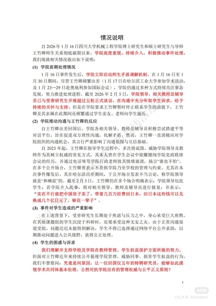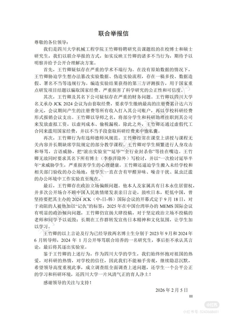 四川大学机械工程学院多名硕士和博士研究生联合向校方举报其导师,并提交了一份共83页的PDF证据材料。举报内容涉及学术问题、经费管理以及师德方面的争议。学生还反映,该导师曾对拒绝参与涉台议题会议投稿的师生进行指责与贬低,此类言行在课题组内已长期引发不满。