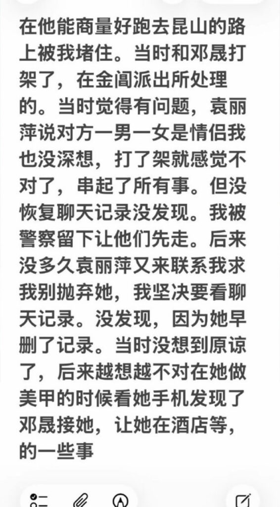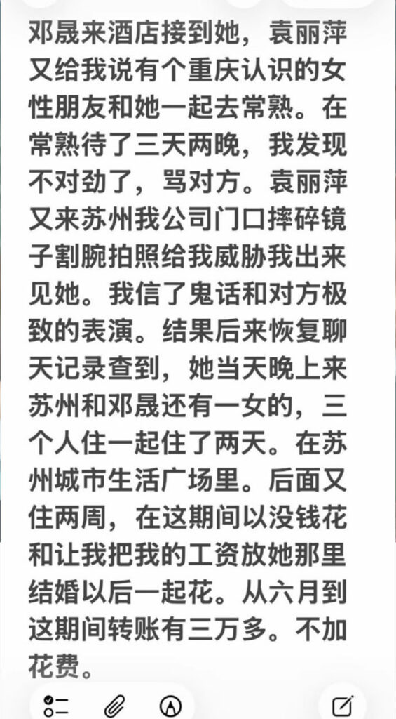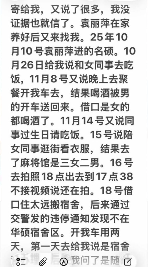 苏州名硕南七工程部员工袁丽萍,男友在社交平台披露称,袁丽萍在工作期间与多名男子交往,数量约为五人;男友因此无法忍受被背叛,选择将相关信息公开。