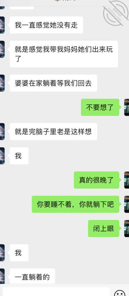 我到了第二天下午才看到,回丈母娘后丈母娘就说昨晚睡不着了,想问一下我家里有没有帮助睡眠的药物,丈母娘确实很少这么晚睡不着,因为丈母娘喜欢和红酒,每天晚上都得喝点红酒,帮助睡眠,今晚不知道咋啦,还吐晚睡不着了,还给我发消息,我也没搞懂,不讲了,老婆今晚要找我做i去了