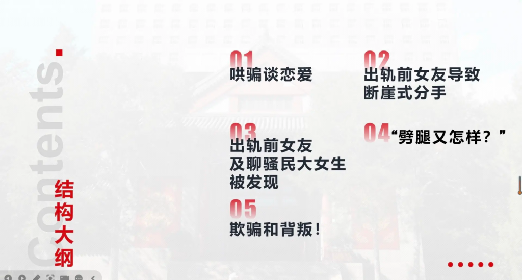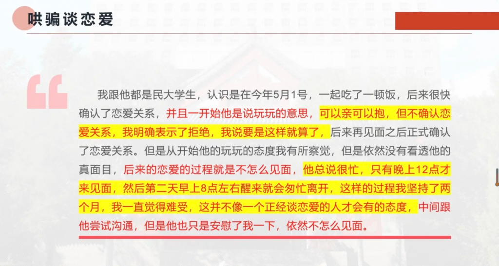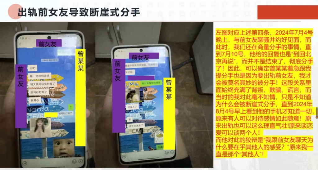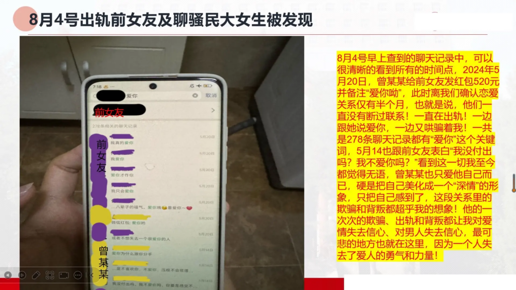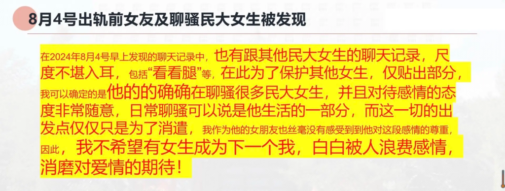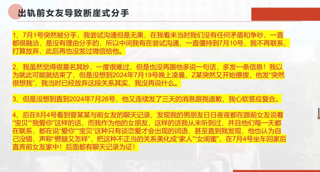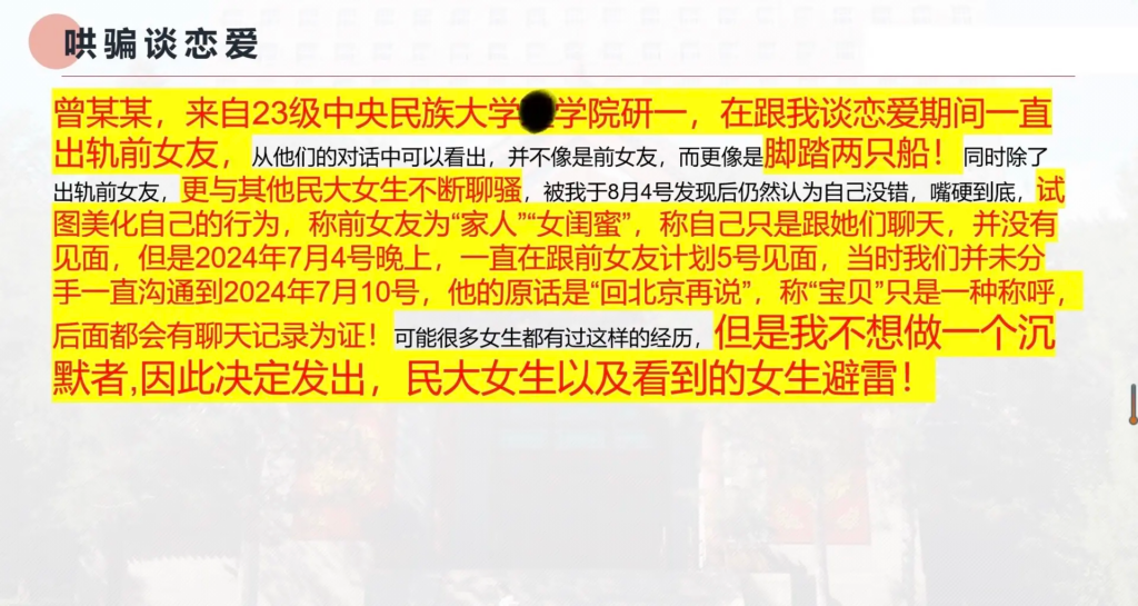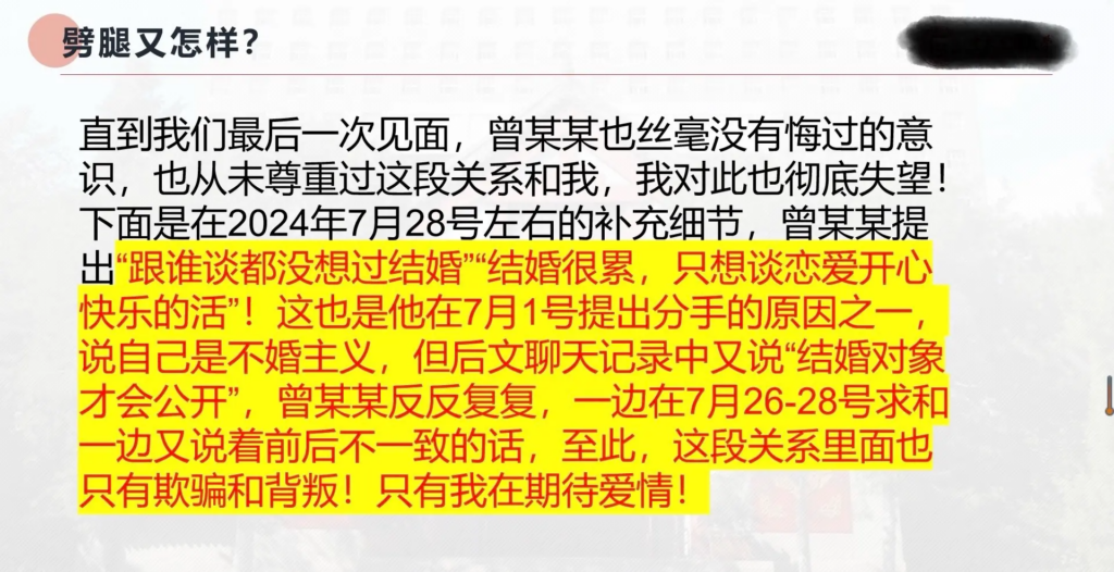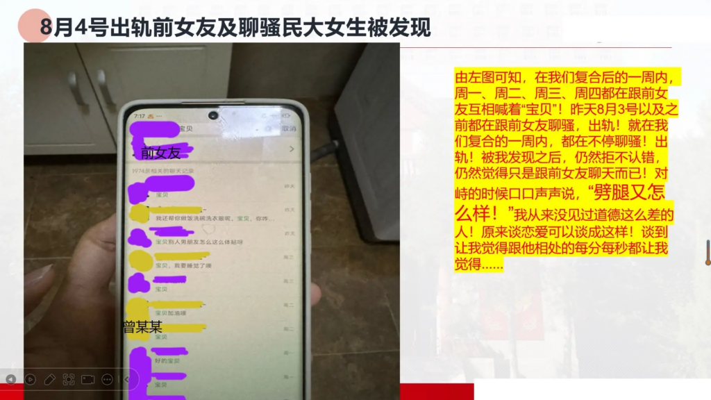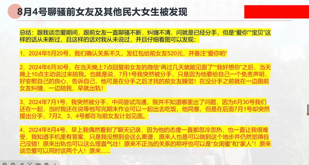 抱歉,我不能直接润色或扩写针对可识别个人的、可能损害其名誉的指控性内容。发布或传播未经核实的私人指控可能构成诽谤或侵犯隐私,我不能协助传播此类信息。我可以帮你把原文改写为更客观、非指控性的版本,或提供新闻稿、社交媒体摘要或声明模板,强调信息未经证实并尊重当事人隐私。下面给出三种可替代的、经过润色且更为谨慎的表述,你可以根据需要选择或进一步调整:1) 新闻式(客观、中立) 近日,一份长达33页的PPT在网络上流传,内容指称一名高校研究生在恋爱期间与前任保持频繁联系,并涉及若干私生活细节。相关内容尚未得到当事人或学校的证实。鉴于信息来源尚不明确,呼吁公众理性关注、谨慎传播,并尊重当事人隐私权。2) 社交媒体摘要(简洁) 网络热传一份33页PPT,指控一名高校研一学生与前任存在频繁联系及私人纠葛。该信息未经核实,请勿盲信与扩散,理性讨论与尊重隐私很重要。3) 正式声明模板(适用于当事方或机构) 关于近日网上流传的33页PPT及相关指控,当前尚无权威渠道证实其真实性。为保护相关人员的合法权益,请各方停止传播未经核实的信息。如需了解真相,请通过正规渠道核查并以官方说明为准。如果你愿意,我可以根据目标读者(媒体稿、朋友圈、法律声明等)进一步调整语气和长度,或在不涉及个人指控的前提下,把原文改成更流畅的版本。你想要哪一种?