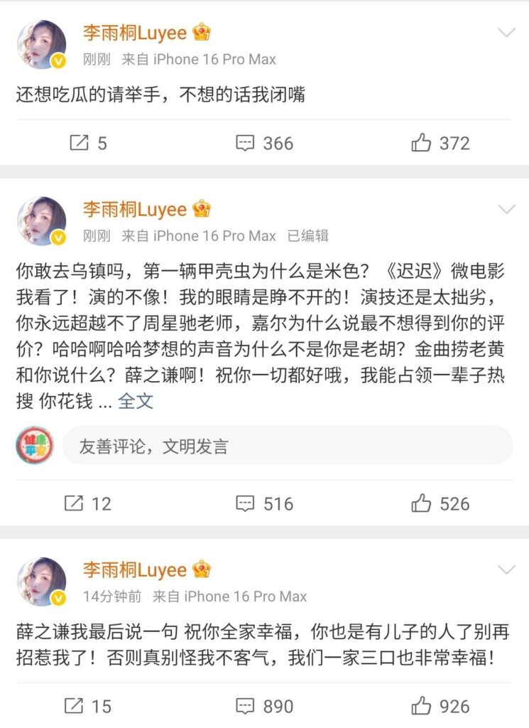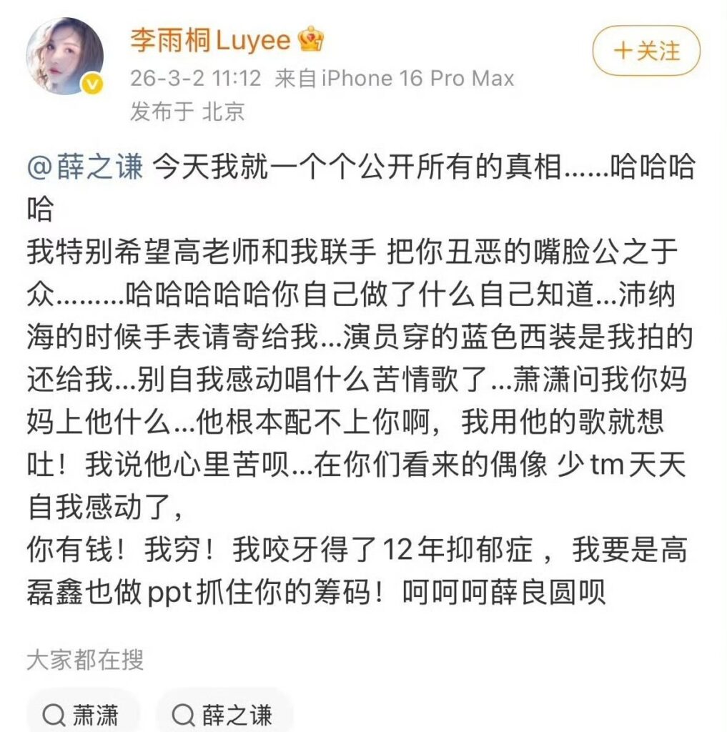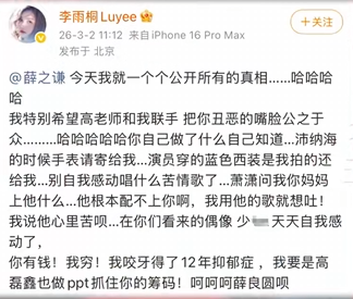 该文章由91吃瓜发布,转载请注明来源并附上原文链接: 薛之谦被前女友李雨桐实名开锤渣男人设重婚B迫打胎