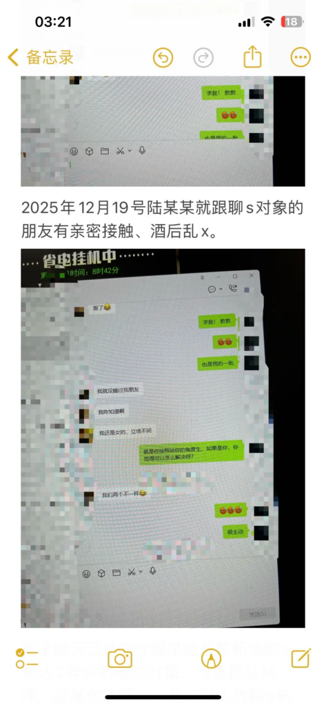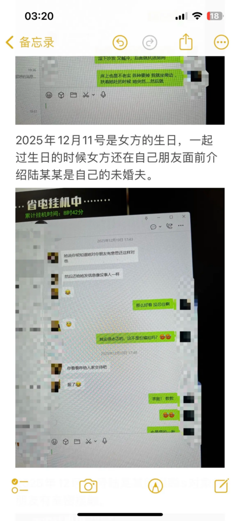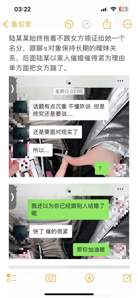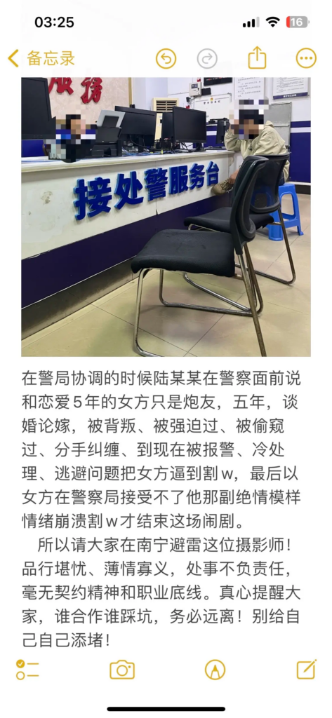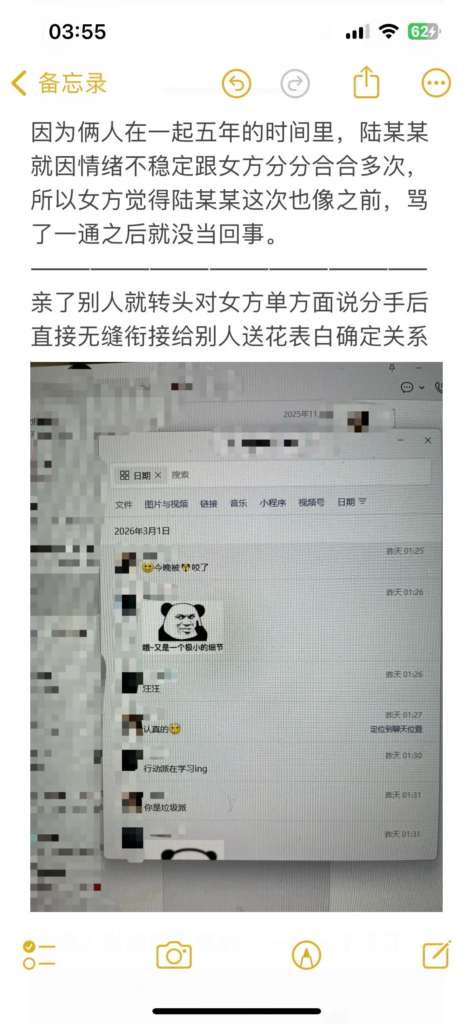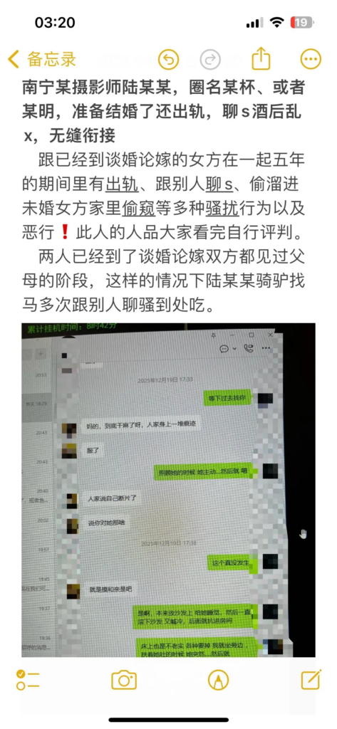在南宁摄影圈,陆某某长期经营“文艺深情、认真负责”的人设,吸引不少人对他产生好感。但现实相反:他已有交往五年的女友,从少女时期一路陪伴到谈婚论嫁。女友以为他会是依靠,却等来背叛与无底线暧昧,甚至近乎病态的跟踪搔扰,行径恶劣,堪称南宁“渣男”典型案例。