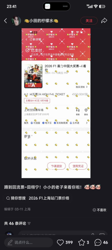 F1上海站乱象流量明星田栩宁现身赛场粉丝挤兑一票难求