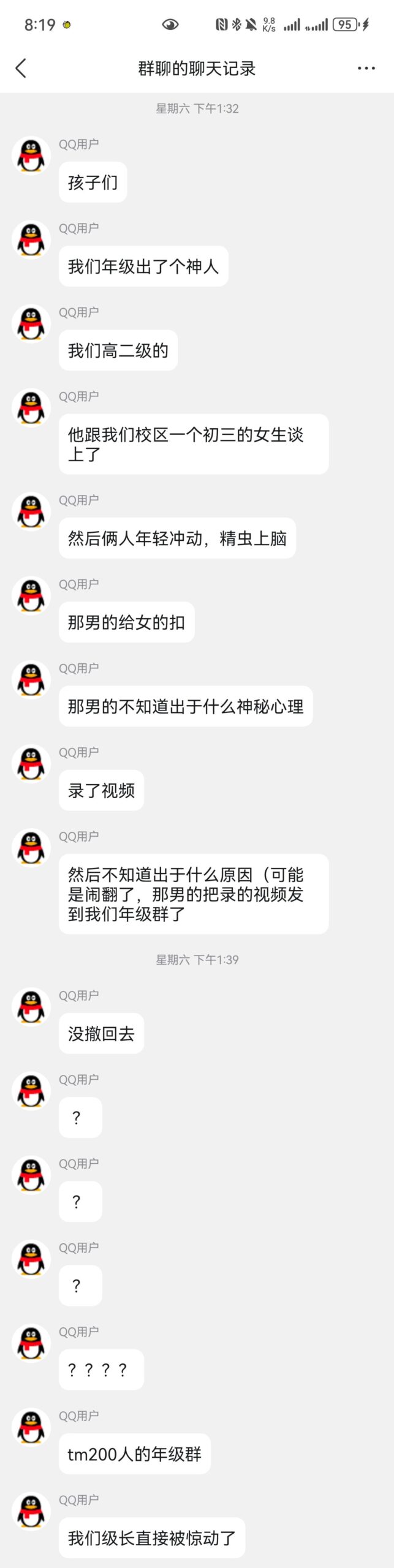 高校神人榜再添一员猛将,广东华侨高校某男生与女友自摸上头,竟然把自己和女友的不雅视频发到年级群,一时间全校出名,其女友更是直接堵到教师当场怒骂渣男。