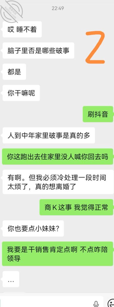 中途聊到她老公每天早出晚归陪客户,之前她的朋友给她说男人陪客户去KTV都是点小姐,她说她自己这两天也质问了她老公,她老公说甲方玩自己没做,她选择相信;问我男的角度怎么看,我说领导玩你不玩,准备收集证据投诉领导? 一句话就给她说沉默了,后面她问我男人在商K都玩啥,因为自己有点收集癖,平时会收集一些资源放在nas,我就给她找了几个视频看了一下,不知道这算不算强行介入他人因果。