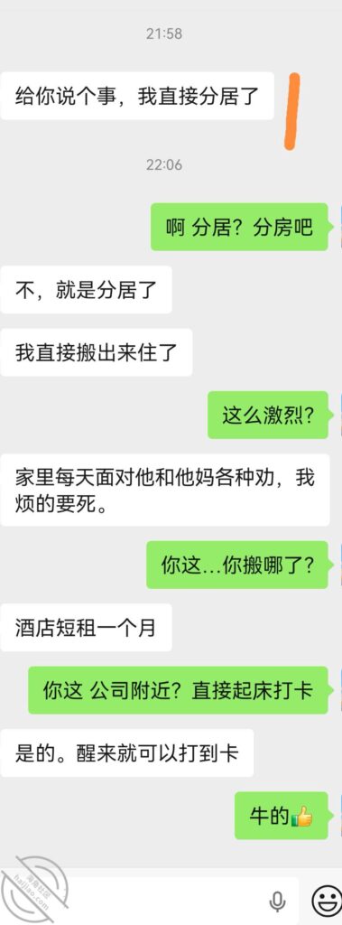 之前分享的老公点小姐的女同事,今天聊天发现她都搬去酒店住了。