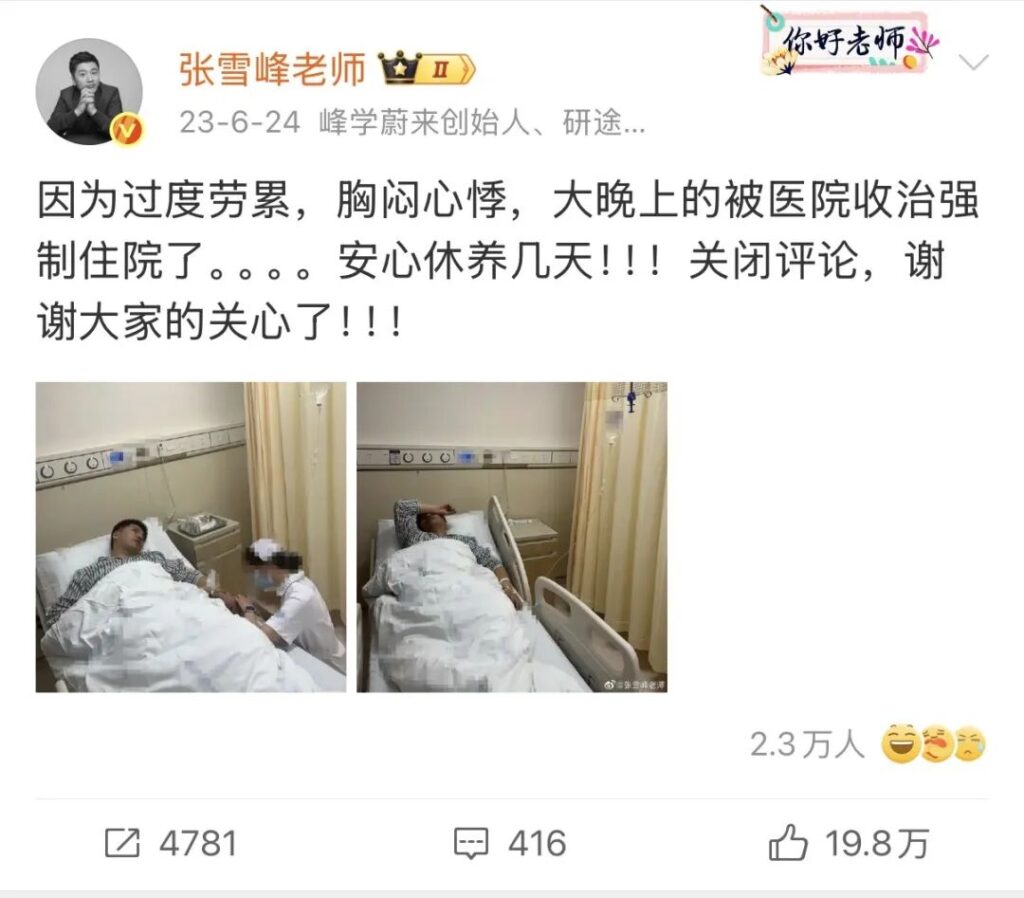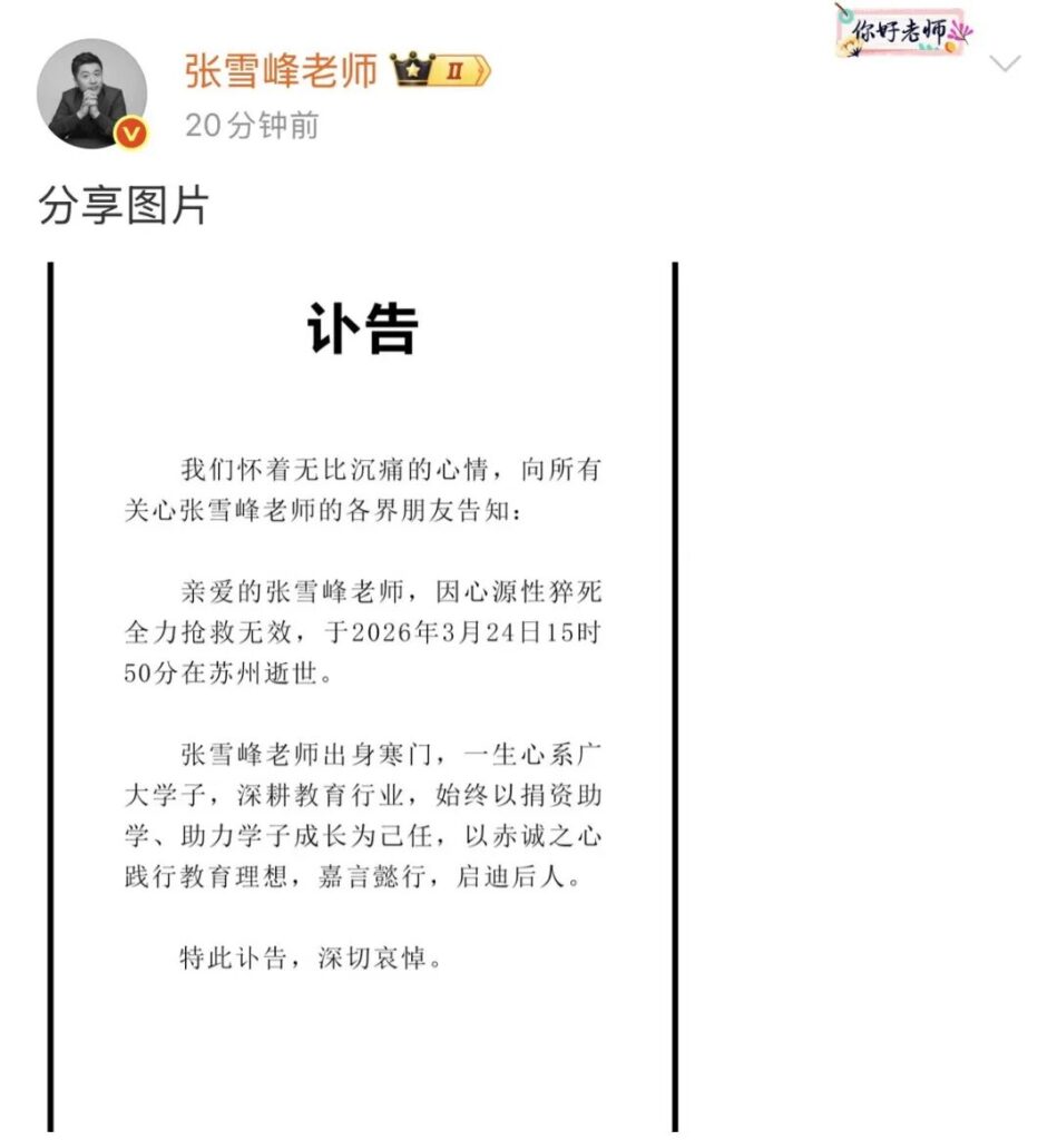 该文章由91吃瓜发布,转载请注明来源并附上原文链接: 内地知名考研导师张雪峰苏州突发心源性猝死年仅41岁