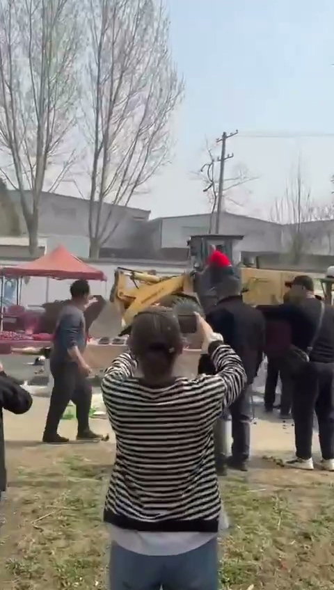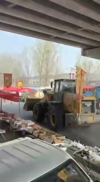 铲车在进入集市后,突然向旁边的摊位碾去