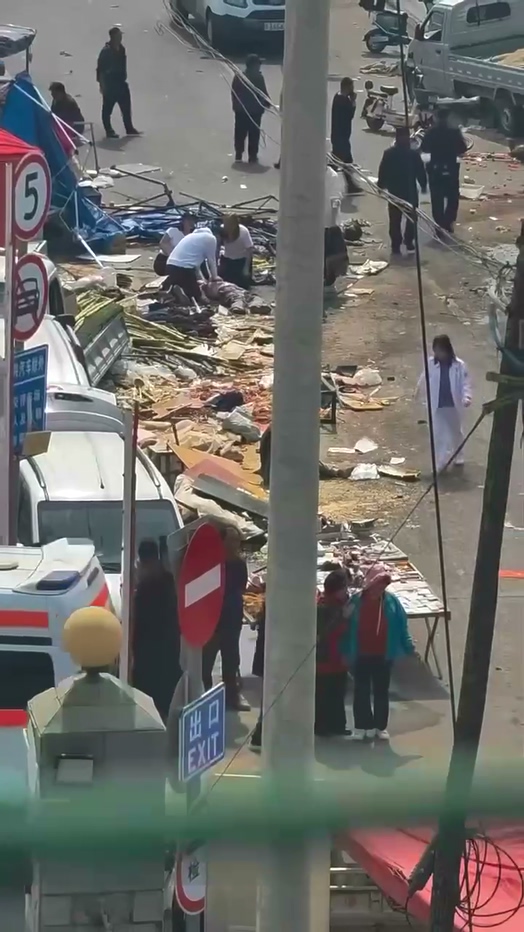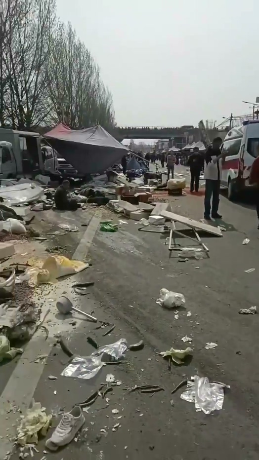 整个现场一片狼藉,大量摊位被冲毁,多名路人与摊贩状况不明