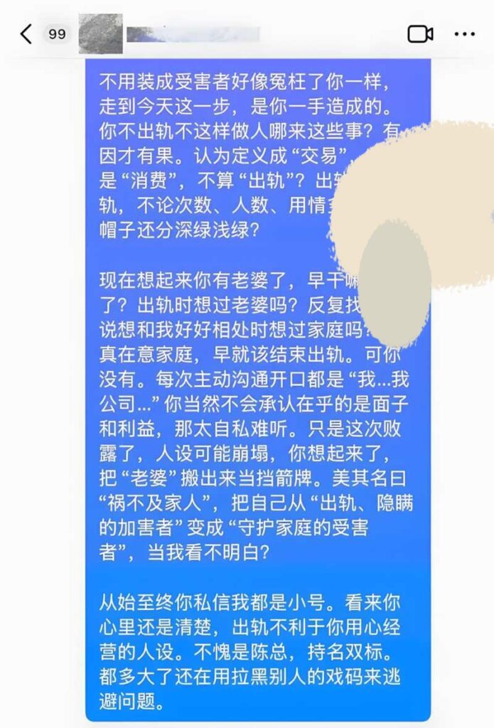 抖音男网红、淳肌妍创始人陈锐人设再度崩塌。表面上,他将自己包装成“钻石王老五”和成功人士,私下却被指以PUA手段Cao控感情,甚至在女方怀孕后逃避责任。随着更多爆料出现,他衣着得体、精心营造的形象也逐渐被揭穿。据称,陈锐在感情中缺乏担当,还可能伤害了多名女生,种种行为令人不齿,堪称“渣男”典型。此次女方再次发声曝光,也像是在长期隐忍后的情绪爆发。接连遭遇伤害与欺骗后,她最终选择公开揭露对方,让整起事件更令人唏嘘。