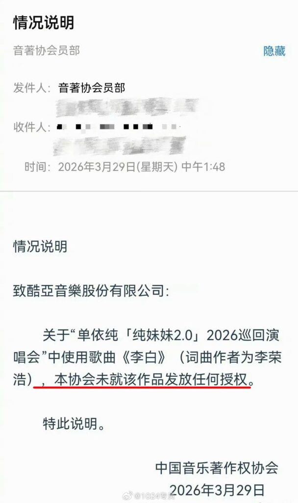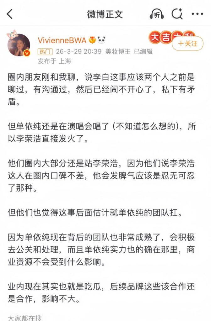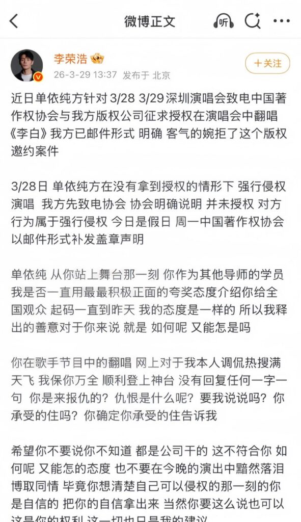 3月28日深圳演唱会上,单依纯在未获得授权的情况下翻唱李荣浩的《李白》,尽管授权申请遭到拒绝,仍坚持登台演唱。29日,李荣浩发长文怒斥其涉嫌侵权,单依纯方面则回应称“正在了解情况”。