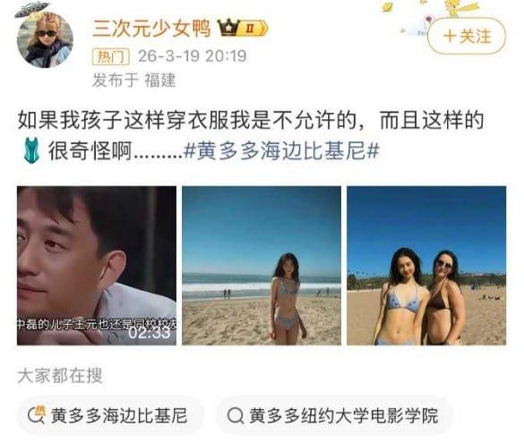 黄多多相关话题再度登上热搜。曾经的“国民闺女”,如今却深陷舆论漩涡,相关讨论持续发酵。由黄磊一手塑造的“国民闺女”形象,似乎也在这一波争议中迅速崩塌。尤其是她在国外拍摄的一组较为暴露的比基尼照片,更是引发了大量争议与热议。