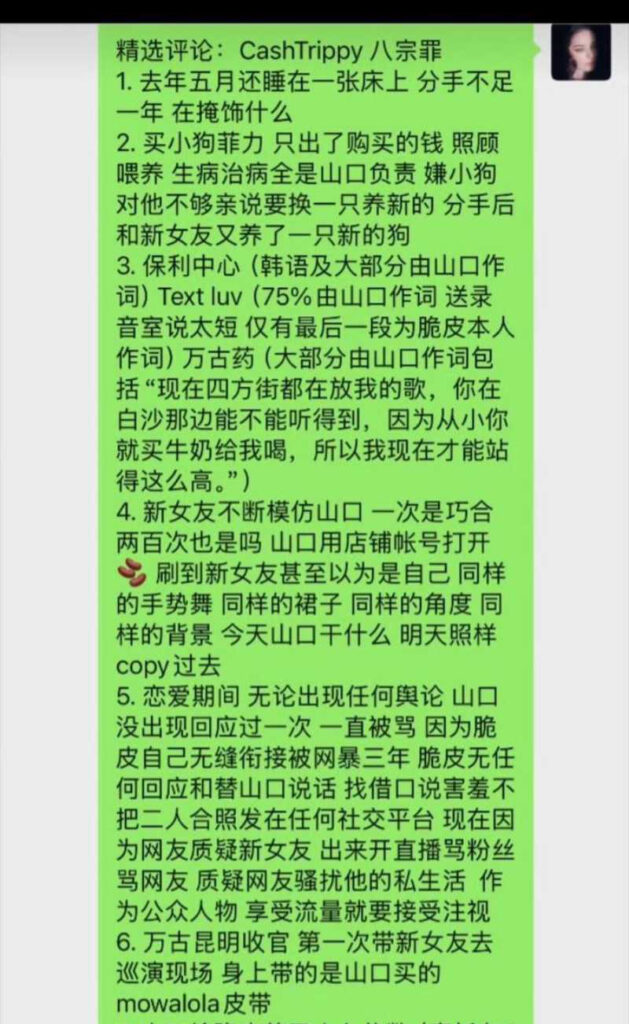 嘻哈圈备受看好的新锐歌手 Cashtrippy,近日遭前女友山口詹娜公开爆料。她称,Cashtrippy在与自己交往期间曾多次出轨、与女网红暧昧聊天,并在分手后迅速公开新恋情,几乎“无缝衔接”现任女友。更令网友震惊的是,山口詹娜还指出,Cashtrippy多首热门歌曲的歌词创作曾有她的参与和协助。她在社交平台晒出聊天记录及时间线等相关证据,直指对方一边维持恋爱关系,一边私下联系多位女网红,感情处理方式引发争议。此外,山口詹娜表示,自己曾在创作上给予不少帮助,如今却遭到前任“背刺”,令不少网友感到意外,也迅速引发广泛讨论与同情。