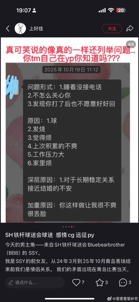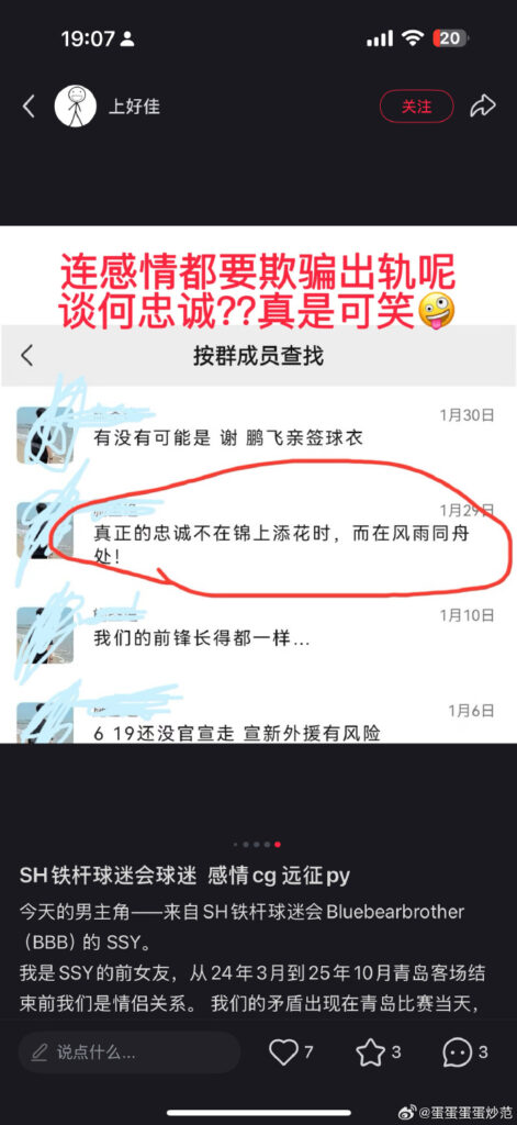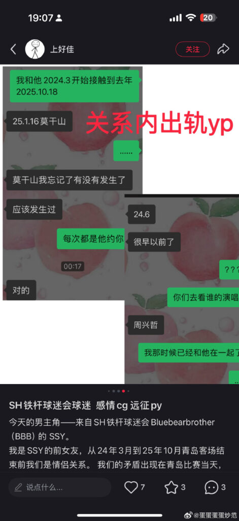 中超圈再度传出史诗级丑闻,上海申花铁杆球迷兼职业赛事裁判ssy被前女友实锤出轨,前女友曝光在ssy在去青岛观看比赛时,竟然是带着炮友一起,本以为自己是正牌女友,没想到和自己交往的整段恋情里,自己才是那个三儿~