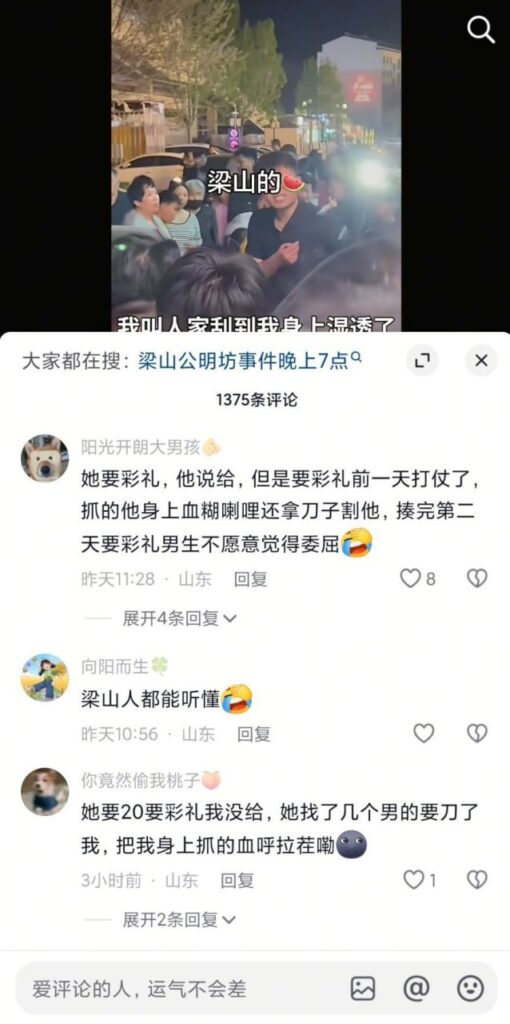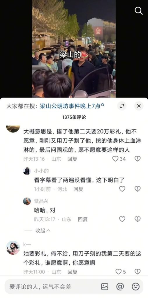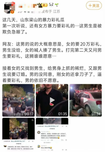 该文章由91吃瓜发布,转载请注明来源并附上原文链接: 山东梁山公明坊彩礼瓜女子暴力索要彩礼组团重击未婚夫