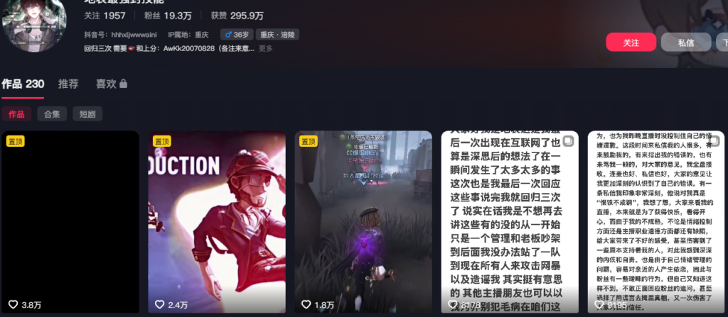 该文章由91吃瓜发布,转载请注明来源并附上原文链接: 5位前女友联手实锤抖音20万粉丝第五人格主播地表最强封技能