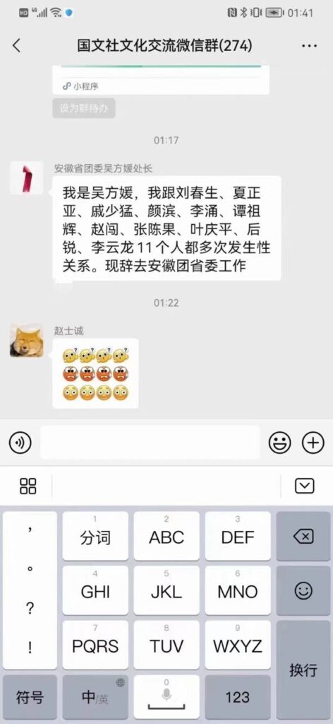 该文章由91吃瓜发布,转载请注明来源并附上原文链接: 安徽青年企业家协会秘书吴方媛微信群自曝与11人多次发生关系